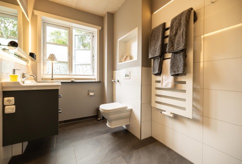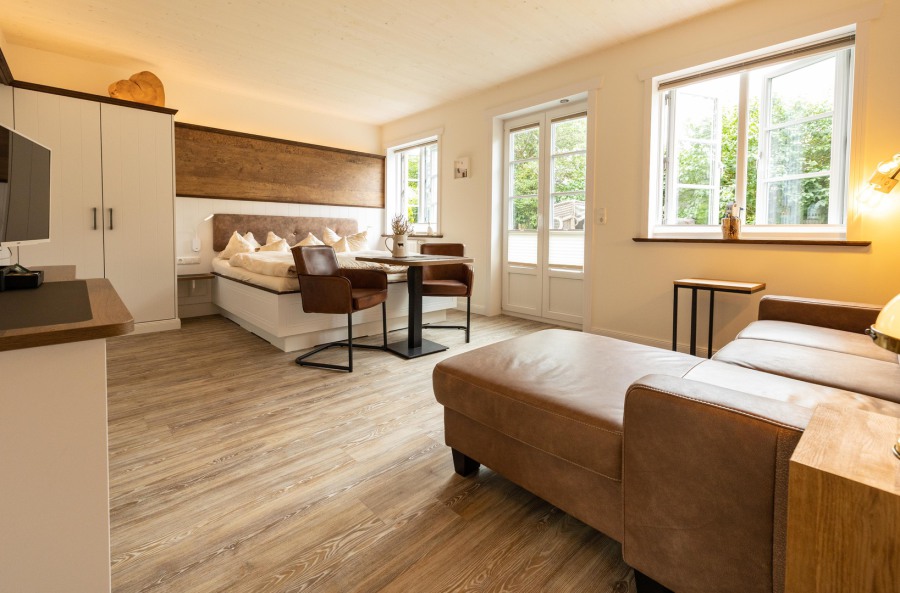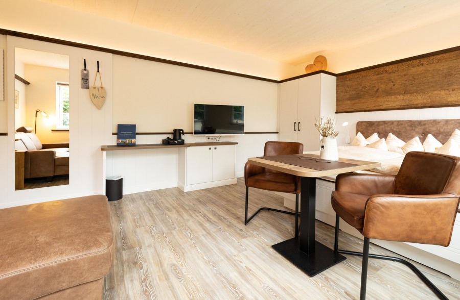 Ein gemütlicher Sitzbereich mit Tisch und bequemen Stühlen lädt zum Verweilen ein. Hochwertige Materialien, eine klare Linienführung und eine ruhige Farbgestaltung unterstreichen den zeitgemäßen Charakter des Zimmers. Die Terrasse erweitert den Wohnraum nach außen und schafft eine angenehme Verbindung zur grünen Umgebung.