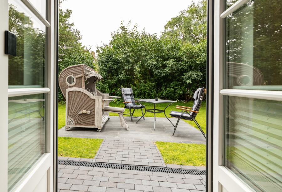 Der Schlafbereich ist mit einem komfortablen Doppelbett ausgestattet und harmonisch in den Raum integriert. Große Fenster sowie eine Terrassentür sorgen für viel Tageslicht und ermöglichen den direkten Zugang zur privaten Terrasse und in den Garten.