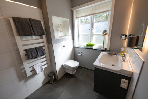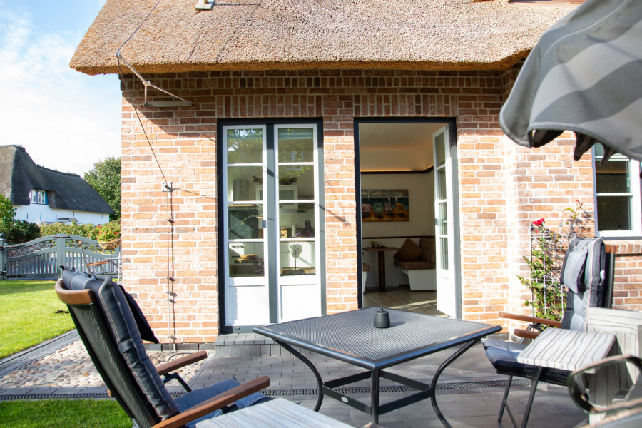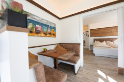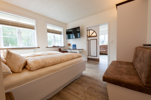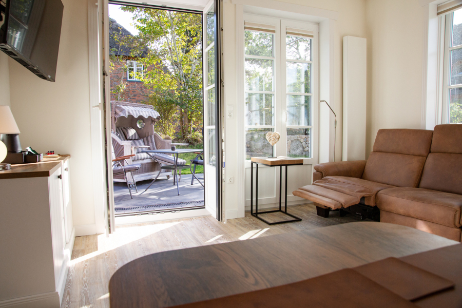 Die stilvolle Suite verfügt über einen hellen Schlafraum mit Schreibtisch, sowie einen lichtdurchfluteten Wohn- und Ess-bereich mit direktem Terrassen-ausgang. Die private Terrasse ist mit Strandkorb und hochwertigen Gartenmöbeln ausgestattet und lädt zum Entspannen ein. Eine kompakte Mini-Küche ergänzt den Wohnbereich funktional. Das komfortable Zwei-Sitz-Sofa bietet dank elektrisch ausfahrbarem Fußteil eine praktische Couch-Funktion. Abgerundet wird die Suite durch eine gemütliche Sitzecke, zwei Fernseher sowie ein modernes, sehr ansprechendes Duschbad.